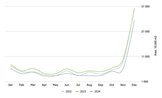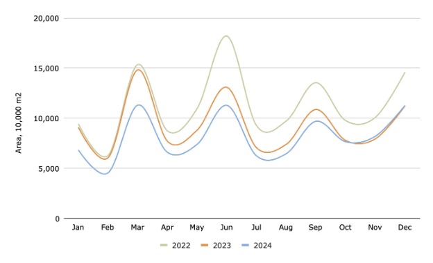 개발자들은 신규 프로젝트에 대해 큰 폭으로 물러났습니다. 건설 중인 건물의 총 면적은 7.33 billion m2로 13% 감소하였고, 신규 착공은 739 million m2로 23% 급감하였습니다. 완공된 프로젝트는 28% 감소한 737 million m2로 더 큰 폭으로 감소했습니다. 주거용 건설은 이러한 감소를 반영하며, 완공된 주택은 27% 감소한 537 million m2이었습니다.