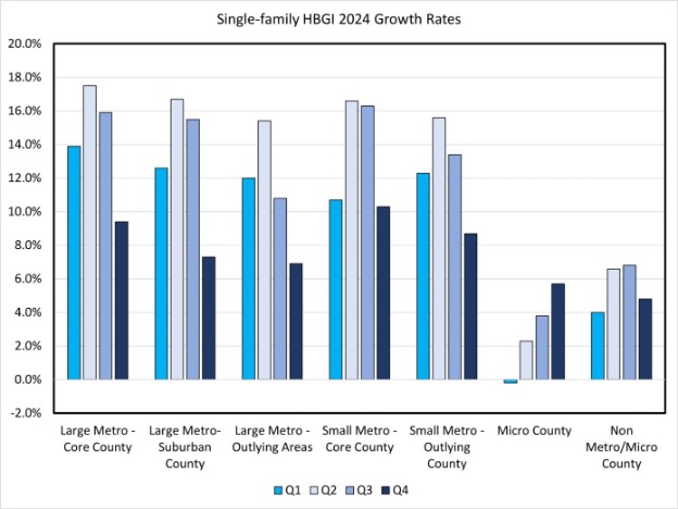 HBGI가 추적한 모든 지역 중에서 소규모 메트로 핵심 카운티는 4분기에 전년 동기 대비 10% 증가하며 가장 큰 성장을 기록했습니다. 비 도시/마이크로 카운티는 같은 기간 동안 거의 5% 증가하며 가장 느린 성장세를 보였습니다. 또한 소규모 메트로 핵심 카운티는 단독주택 건설에서 가장 큰 비중을 차지하여 전체 신규 프로젝트의 29%를 차지했으며, 비도시/마이크로 카운티는 4%로 가장 작은 시장 점유율을 기록했습니다.