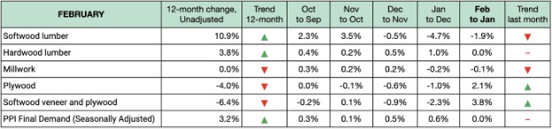 목재 공작 생산자 물가 지수(Producer Price Index : PPI)는 1월의 0.2% 하락하였고, 2월에는 0.1% 하락했습니다. 합판 생산자 물가 지수(Producer Price Index : PPI)는 2월에 2.1% 상승하여 1월의 1% 하락을 반전시켰습니다. 침엽수 단판(veneer)와 합판 생산자 물가 지수(Producer Price Index : PPI)는 1월에 2.3% 하락한 후 2월에 3.8% 상승하였습니다.