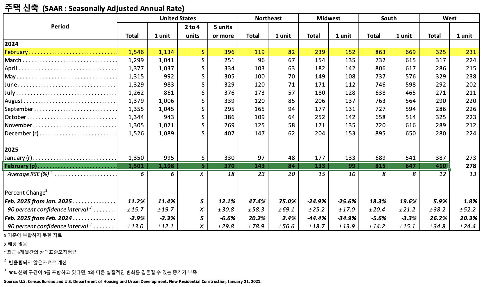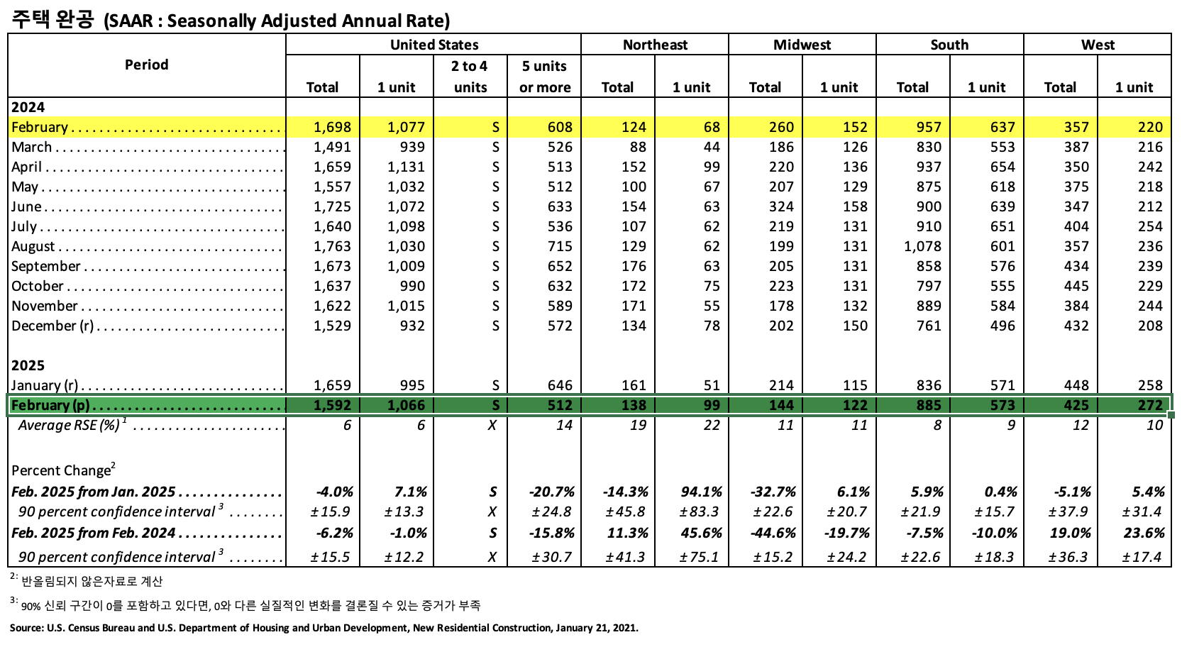 2025년 2월 말 기준으로 판매가능한 신규 주택은 500,000인데, 현재 판매율로 8.9개월 동안 공급가능한 물량입니다. 이 재고 수치는 2025년 1월에 기록된 9개월 공급량보다는 약간 증가했지만 2024년 2월의 8.7개월 공급량과 비교하면 안정적인 수준을 유지하고 있습니다.