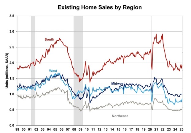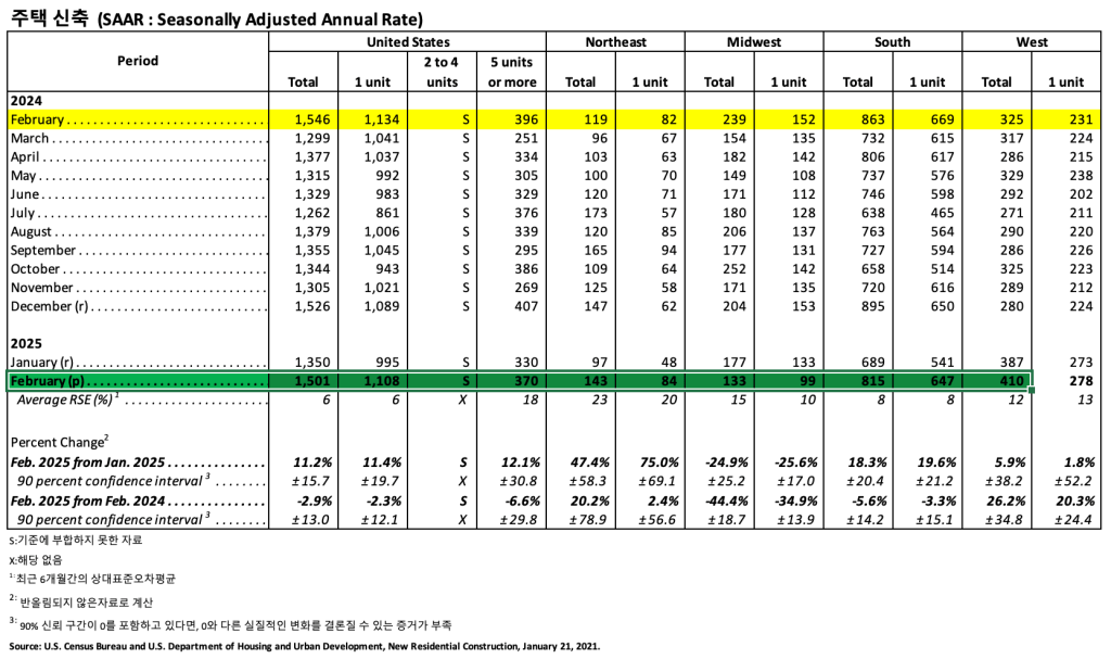 지역별로 주택 판매 실적은 다양했습니다. 중서부 지역은 1월 6만 3천에서 2025년 2월 76,000으로 20.6% 증가하며 가장 큰 폭의 증가세를 기록했습니다. 남부 지역도 6.6% 증가한 438,000을 기록하며 성장세를 보였습니다. 반대로 동북부 지역은 21.4% 감소한 22,000, 서부 지역은 13.6% 감소한 140,000을 기록했습니다.
