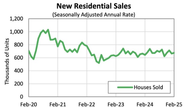 미국의 신규 단독 주택 판매량은 2025년 2월 계절 조정 연이율 기준으로 676,000 가구로 증가하여 1월 개정 수치인 664,000 가구보다 1.8% 증가했습니다. 이는 또한 미국 인구 조사국(U.S. Census Bureau)과 주택 도시 개발부(Department of Housing and Urban Development)에 따르면 2024년 2월 총 644,000 가구보다 5.1% 증가한 수치입니다.