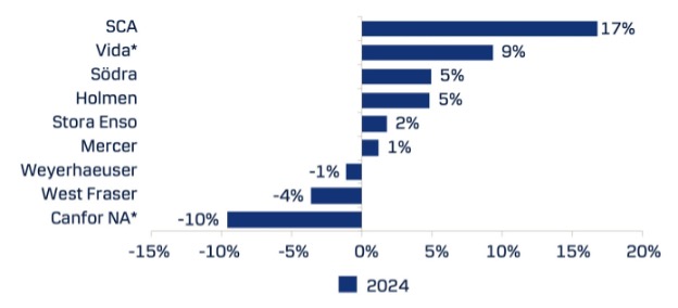 2024년 동안 목재 가격이 완만히 상승했음에도 불구하고 스웨덴 제재소는 수익성이 좋지 않았습니다. 극도로 높은 목재 가격과 가끔씩 발생하는 목재 부족으로 인해 감가상각 전에도 영업 이익이 거의 또는 0에 가까워졌습니다. Södra와 Stora Enso는 감가상각 전 마진이 0에 가까웠으며, Holmen은 약간 긍정적인 이익을 유지하였다고 보고하였습니다. SCA는 16.5%의 이익으로 두각을 나타내며 스웨덴 제재소 사업 중 가장 수익성이 높았었습니다. 2024년 한 해 동안 SCA의 제재소는 다른 스웨덴 제재소 평균보다 383 SEK/m3 더 많은 수익을 올렸습니다. Vida의 연간 데이터는 제공되지 않았지만 9개월간의 실적을 기준으로 작성되었습니다.