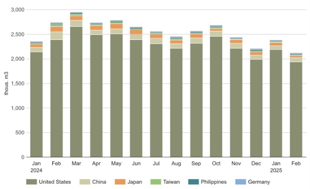 2025년 2월 캐나다 침엽수 제재목 수출량은 전년대비 23% 감소하여 2.15 million m3이었고, 미국으로의 수출은 19% 감소하여 1.94 million m3이었지만 여전히 지배적이었습니다. 캐나다 침엽수 제재목의 중국 수출량은 49% 감소하여 81 thousand m3이었고, 일본 수출량은 57% 감소하여 47 thousand m3, 대만 수출량은 60% 감소하여 16 thousand m3이었습니다. 다른 주요 시장인 필리핀 수출량은 22% 하락하여 13 thousand m3, 독일 수출량은 2배이상 감소하여 12 thousand m3이었습니다.