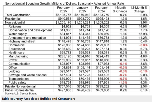 ABC는 20,000명 이상의 회원을 대표하는 미국의 건축과 건설업자 무역 협회입니다. 이 단체는 미국 인구 조사국(US Census Bureau)의 데이터를 분석하여 비주거용 건설 지출의 역사적인 월 수치를 결정했습니다. 고속도로와 도로 지출의 급증이 월별 증가의 40% 이상을 차지했으며, 공공 부문 비주거 지출은 현재 전년대비 6% 이상 증가했다고 Anirban Basu는 언급하였습니다. 2월의 세부 사항에 따르면, 16개 비주거 부문 중 9개 부문에서 지출이 월별로 증가했습니다. 2월에는 민간 비주거 지출이 0.4% 증가한 반면, 공공 비주거 건설 지출은 0.2% 증가했습니다. 그러나 올해에는 민간 부문의 상업용 또는 비주거용 건설 지출이 감소했습니다. 안타깝게도 민간 부문 지출은 이 속도를 따라가지 못했으며 지난 2월 이후 2.5% 증가에 그쳐 경제 전반의 인플레이션보다 느린 증가율을 기록했다고 Anirban Basu는 덧붙였습니다. 그리고 그는 건설에 대한 잠재적인 역풍에도 불구하고 계약업체의 신뢰도는 여전히 높다고 말했습니다. 고금리, 긴축 대출 기준, 무역 정책과 관련된 전례 없는 불확실성의 조합은 향후 몇 달 동안 민간 부문 건설에 계속 부담을 줄 것이라고 Anirban Basu는 말했습니다. 이러한 지속적인 역풍과 관세가 시행됨에 따라 원자재 가격이 상승할 것이라는 기대에도 불구하고 계약업체들은 향후 6개월 동안의 전망에 대해 여전히 낙관적이라고 주장하였습니다.