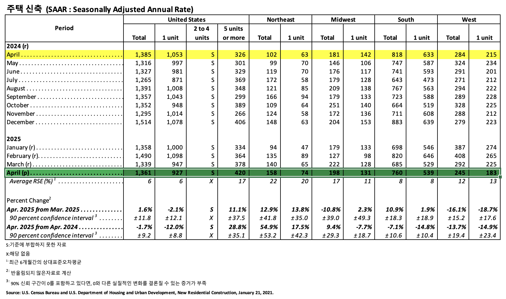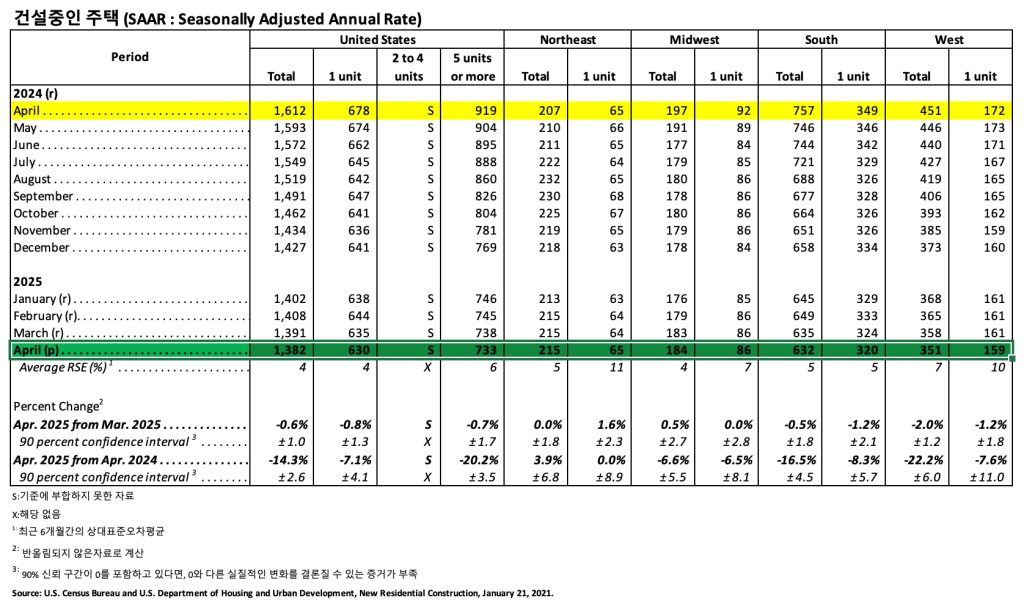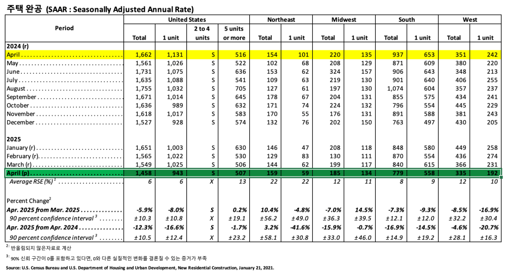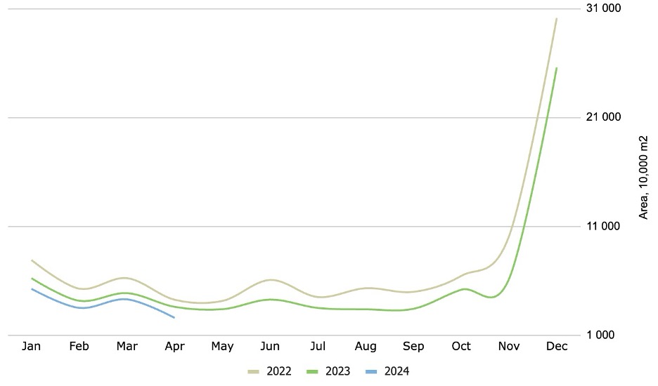 주택 신축 면적은 연간 환산 5억 3,500만 m²로 3월 대비 3% 증가했지만 전년 동기 대비 22% 감소했습니다. 이 수치는 5년 평균보다 62%, 10년 평균보다 68% 낮은 수준입니다. 신규 건설은 3월 대비 24% 감소했으며 전년 동기 대비 22% 감소했습니다. 완공 면적은 2,600만 m²로 3월 대비 40%, 2024년 4월 대비 28% 감소했습니다. 4월 말 기준으로 개발 중인 면적은 1.1% 증가한 62억 300만 m²를 기록했습니다.