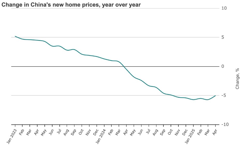 중국의 부동산 투자는 2025년 4월 7조 8,300억 위안으로 감소하여 3월 대비 15%, 2024년 4월 대비 12% 감소했습니다. 상업용 주택 판매량은 6,400만m²로 전월 대비 43%, 전년 동기 대비 3% 감소했습니다. 국가 통계국(National Bureau of Statistics)에 따르면 상업용 주택 판매량의 연간 환산 연초 대비 누계는 8억 4,800만m²로 5년 평균보다 39%, 10년 평균보다 43% 낮습니다. 4월 신규 주택 가격은 3월 대비 0.1% 상승했지만, 전년 동기 대비 5% 낮은 수준을 유지했습니다.