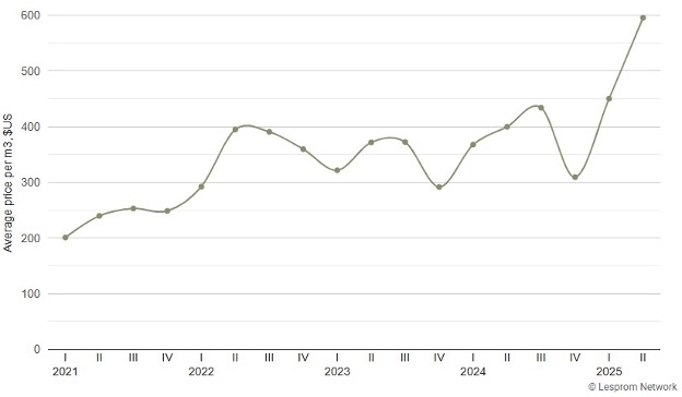 중국의 건설 경기 감소는 건축 자재 수요에 영향을 미쳤습니다. 2025년 1-4월 침엽수 제재목 수입량은 전년 대비 17% 감소했습니다. 러시아는 중국 침엽수 제재목 수입량의 71%를 차지하며 최대 공급국 자리를 지켰습니다. 러시아산 침엽수 제재목은 352만m³로 전년 동기 대비 7% 감소했습니다. 벨라루스산 수입량은 17% 감소한 34만2천m³였고, 캐나다산 선적량은 36% 감소한 30만9천m³였습니다. 스웨덴과 핀란드는 각각 17만2천m³와 12만7천m³를 공급하여 25%와 57% 감소했습니다.평균 가격은 캐나다산 $188/ m³에서 핀란드산 $237/m³까지 다양했습니다. 2025년 1월부터 4월까지 중국의 총 원목 수입량도 전년 대비 12% 감소했습니다.