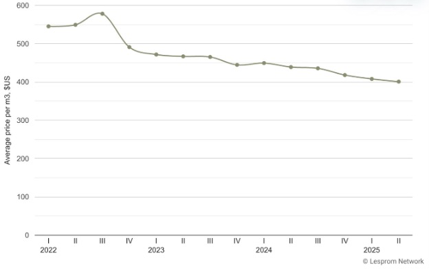 Average export price of plywood from China ($ per m3), January 2022–May 2025