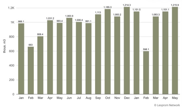 China’s plywood exports (thousand m3), January 2024–May 2025
