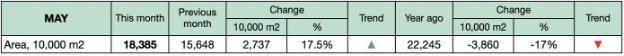 2025년 5월 완공 면적은 18 million m2으로 4월과 비교하여 18% 증가하였지만 작년 같은 기간과 비교하여 19% 감소하였습니다. 개발 면적은 1% 6.3 billion m2으로 4월말의 6.2 billion m2보다 약간 증가하였습니다.