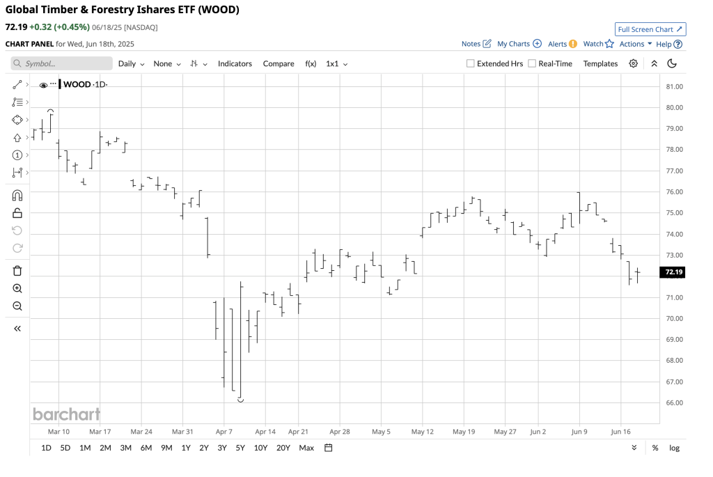 주당 $72.19인 WOOD ETF는 $198.70 million의 운용자산을 보유하고 있습니다. WOOD는 일평균 3,635주를 거래하며 0.41%의 운용보수를 부과합니다. WOOD의 $1.09 혼합 배당금은 1.51%의 수익률로 환산되며, 이는 약 1/4분기 동안 비용 비율을 상쇄합니다. 관세는 2025년 제재목 가격보다 저조한 성과를 보인 WOOD ETF에 부담을 주었습니다. WOOD ETF는 2024년 마감가를 주당 $76.34로 마감했습니다. 제재목 가격은 2025년 6월 중순에 2024년 종가보다 높은 반면, WOOD ETF는 5.44% 하락한 주당 $72.19를 기록했습니다. 2025년 4월 2일 미국의 Liberation Day 선언은 모든 자산군의 시장을 급락 시켰습니다.