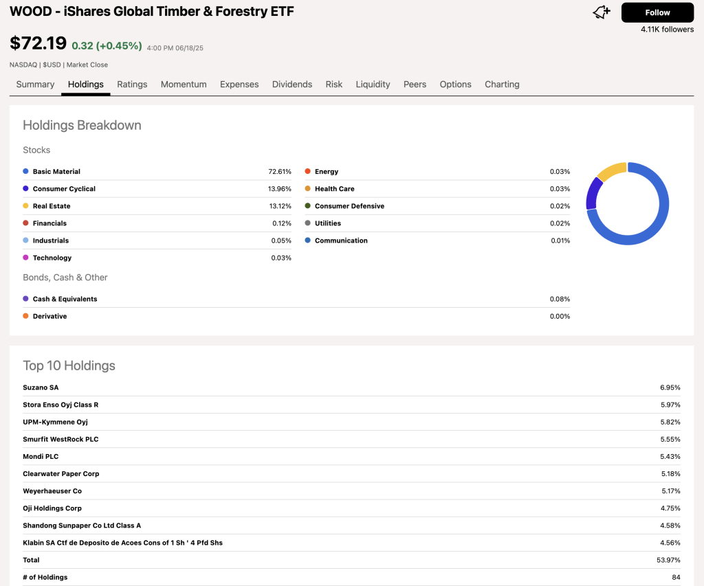 월별 차트에 따르면 제재목 선물 가격은 2025년 3월에 $699로 최고치를 기록했습니다. 2025년 6월 중순 $618였던 가격은 2024년 말 종가보다 높았습니다. 제재목은 여전히 유동성이 매우 낮은 선물 시장이므로, WOOD ETF와 같은 대용 상품과 제재목 관련 주식과 ETF는 시간 경과에 따른 목재 가격과 상관관계를 보이며 선물 시장의 대안으로 활용됩니다. WOOD ETF는 국제 제재목 관련 기업을 보유하고 있습니다. iShares Global Timber & Forestry ETF의 주요 보유 종목은 다음과 같습니다. Top Holdings of the WOOD ETF Product (Seeking Alpha)