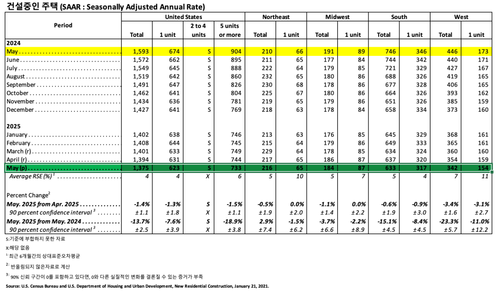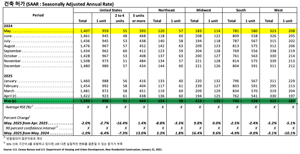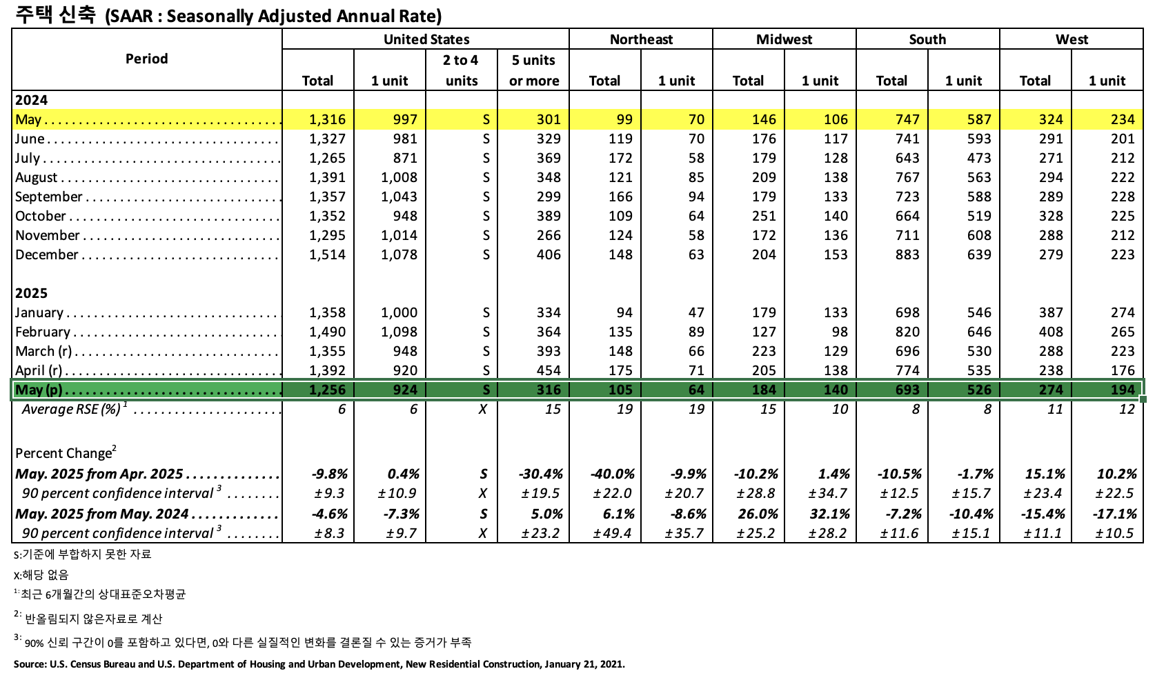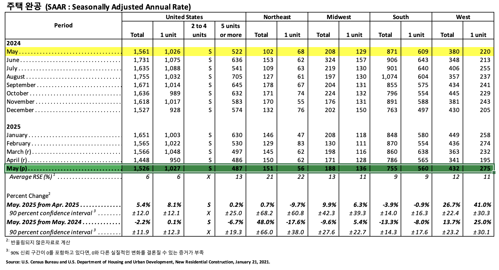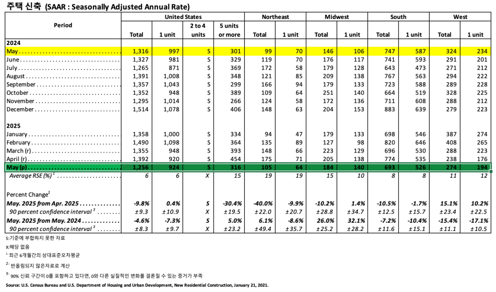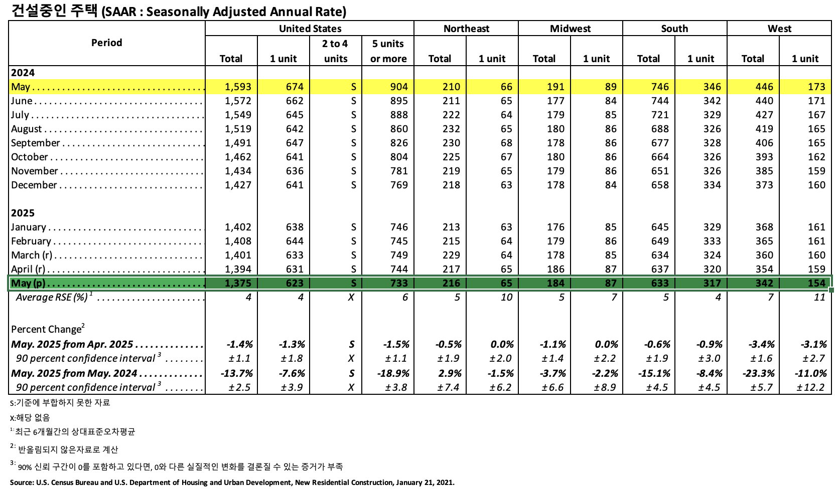 미국 인구 통계국 (U.S. Census Bureau)과 미국 주택과 도시 개발부 (U.S. Department of Housing and Urban Development)는 2025년 5월 미국 거주용 주택 건설 통계 자료를 합동으로 발표하였습니다.