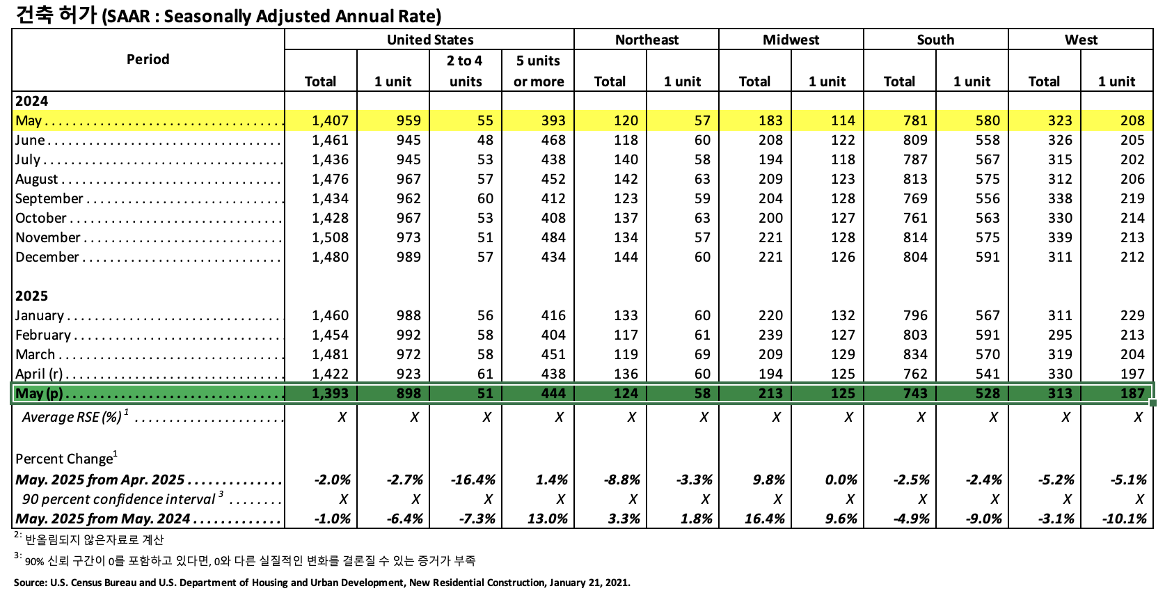 2025년 5월 사유 주택 건축 허가는 1,393,000 (SAAR : Seasonally Adjusted Annual Rate) 으로 2025년 4월 (1,422,000) 보다 2.0% 하락하였고, 2024년 5월 (1,407,000)과 비교하여 1.0% 하락하였습니다. 2025년 5월 단독 주택 건축 허가는 898,000 (SAAR)로 2025년 4월 (923,000)과 비교하여 2.7% 하락하였습니다. 5가구 이상의 다중 건물의 5월 허가는 444,000 (SAAR) 이었습니다.