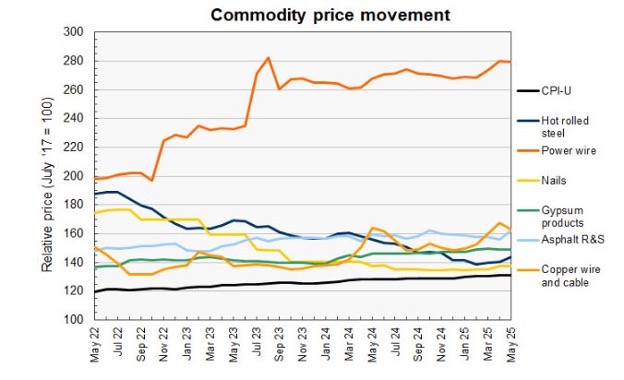 노동 통계국(Bureau of Labor Statistics : BLS)의 생산자 물가 지수(Producer Price Index : PPI) 보고서에 따르면 계절조정 기준으로 2025년 5월 건설 자재 가격은 전월 대비 0.2% 상승했습니다. 건설용 부품과 자재 지수는 전년 대비 1.9% 상승했습니다. 중간 수요를 위한 가공 상품의 전체 가격은 이번 달 0.1% 상승했습니다. 가장 큰 폭의 상승을 보인 품목은 내구재로 2.2% 상승했습니다. 가공 연료와 윤활유의 변동성 가격 지수는 이번 달에도 1.2% 하락했습니다. 중간 수요를 위한 가공 상품 전체 지수는 전년 대비 1.9% 상승했습니다. 참고로 이러한 지수의 변화는 5월 계절 조정된 전체 품목의 소비자 물가 지수(CPI-U)의 전월 대비 0.1% 상승 및 전년 대비 2.4% 상승과 비교됩니다.