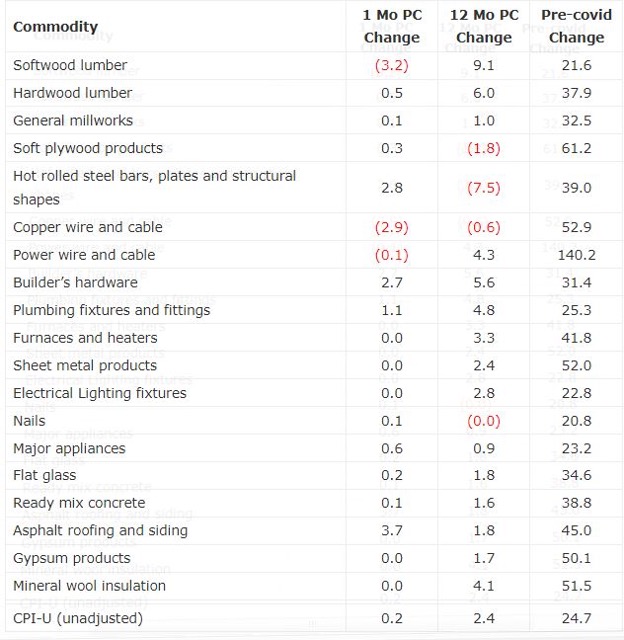 아래 차트는 여러 다른 건축 자재 가격의 최근 경향을 보여줍니다. 이러한 자재들은 비교적 단순한 원자재로 구성 자재의 가격에 따라 가격이 크게 좌우됩니다.