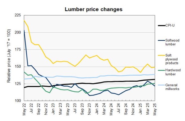 5월 침엽수 제재목 가격 지수는 최근 하락세를 이어갔습니다. 그러나 올해 9.1% 상승은 저희가 추적하는 건축 자재 가격 중 전년 대비 가장 큰 폭의 상승입니다. 지난달 침엽수 합판 가격 지수는 이번 달에 1.5% 하향 조정되었습니다. 따라서 이번 달 가격 지수가 상승한 것으로 보도되었지만 실제로는 지난달보다 1.2% 낮습니다.