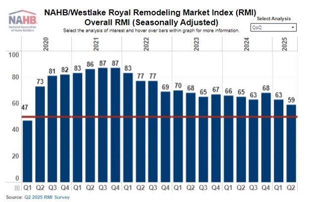 2025년 2사분기 NAHB//Westlake Royal Remodeling Market Index(RMI)는 전 분기 대비 4포인트 하락한 59를 기록했습니다. 이 수치는 여전히 긍정적이지만, 특히 서부 지역의 일부 리모델링 업체들은 시장 활동 둔화를 겪고 있습니다. 2사분기 59는 2020년 1사분기에 설문 조사가 수정된 이후 RMI가 60 아래로 떨어진 두 번째 사례입니다. 높은 금리와 전반적인 경제 불확실성은 소비자 심리에 영향을 미치고 리모델링에 역풍을 일으키고 있지만, 단독주택 건설만큼 심각하지는 않습니다. 이는 6월 NAHB/ Wells Fargo Housing Marketing Index(HMI)의 마이너스 수치에서 분명히 드러납니다. 결과적으로 NAHB는 2025년 리모델링 지출이 여전히 견고한 증가세를 보일 것으로 전망하고 있으며, 2026년에는 다소 완만하지만 여전히 긍정적인 성장세를 보일 것으로 예상합니다. RMI는 주택 리모델링 업체들에게 주택 리모델링 시장의 다양한 측면을 “좋음”, “보통”, “나쁨”으로 평가하도록 요청하는 설문조사를 기반으로 합니다. 각 질문에 대한 답변은 0에서 100까지의 지수로 변환됩니다. 지수가 50을 초과하면 더 많은 응답자가 주택 리모델링 시장 상황을 “나쁨”보다는 “좋음”으로 평가함을 나타냅니다.