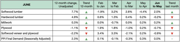 2025년 6월 침엽수 제재목 생산자 가격 지수(softwood lumber Producer Price Index : PPI)는 2% 상승하였다고 미국 노동 통계국(U.S. Bureau of Labor Statistics)이 보고하였습니다. 활엽수 제재목 PPI는 5월에 0.2% 상승한 이후에 6월에 0.2%로 약간 하락하였습니다. 목공 PPI는 0.2% 상승하여 5월과 같은 수준을 유지했습니다. 반대로 합판 PPI는 0.7% 하락하여 전월 0.2% 상승에서 반전했습니다. 침엽수 단판(veneer)와 합판 PPI도 5월 0.2% 상승 후 0.9% 하락했습니다.