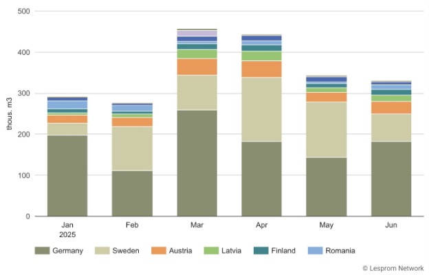2025년 1월부터 6월까지 유럽 연합(European Union)의 침엽수 제재목 미국 수출량은 전년 대비 5% 증가하여 2,150,000 m³이었고, 수출액은 15% 증가한 $740 million를 기록했으며, 수출 평균 가격은 10% 상승한$344/m³를 기록했습니다. 독일은 EU에서 대미 수출국 중 가장 큰 규모인 1,080,000 m³를 수출하여 EU 전체 수출량의 50%를 차지했습니다. 스웨덴은 580,000 m³(27%)로 2위를 차지했고, 오스트리아는 177,000 m³(8%), 라트비아는 86,000 m³(4%)로 그 뒤를 이었습니다.