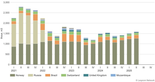 지난 5년간 EU의 원목 수입량은 2021년 상반기 5,070,000m³에서 2025년 상반기 3,110,000m³로 39% 감소했습니다. 2021년 2,530,000m³로 시장 점유율 49.8%를 기록하며 최대 공급국 이었던 러시아는 2022년 제재 이후 EU 시장에서 완전히 철수했습니다. 노르웨이는 같은 기간 물량이 1,890,000m³에서 2,500,000m³로 33% 증가했고, 점유율도 37.2%에서 80.3%로 두 배 이상 증가했습니다. 브라질은 출하량을 12% 늘렸지만 점유율은 감소했습니다. 영국은 수출량을 7,500m³에서 50,600m³로 늘렸고, 아일랜드, 말레이시아, 보스니아, 헤르체고비나와 같은 신규 공급국들이 소량으로 EU 시장에 진입했습니다. 한편, EU의 평균 수입 가격은 $74.4/m³에서 $123.4/m³로 66% 상승했습니다.