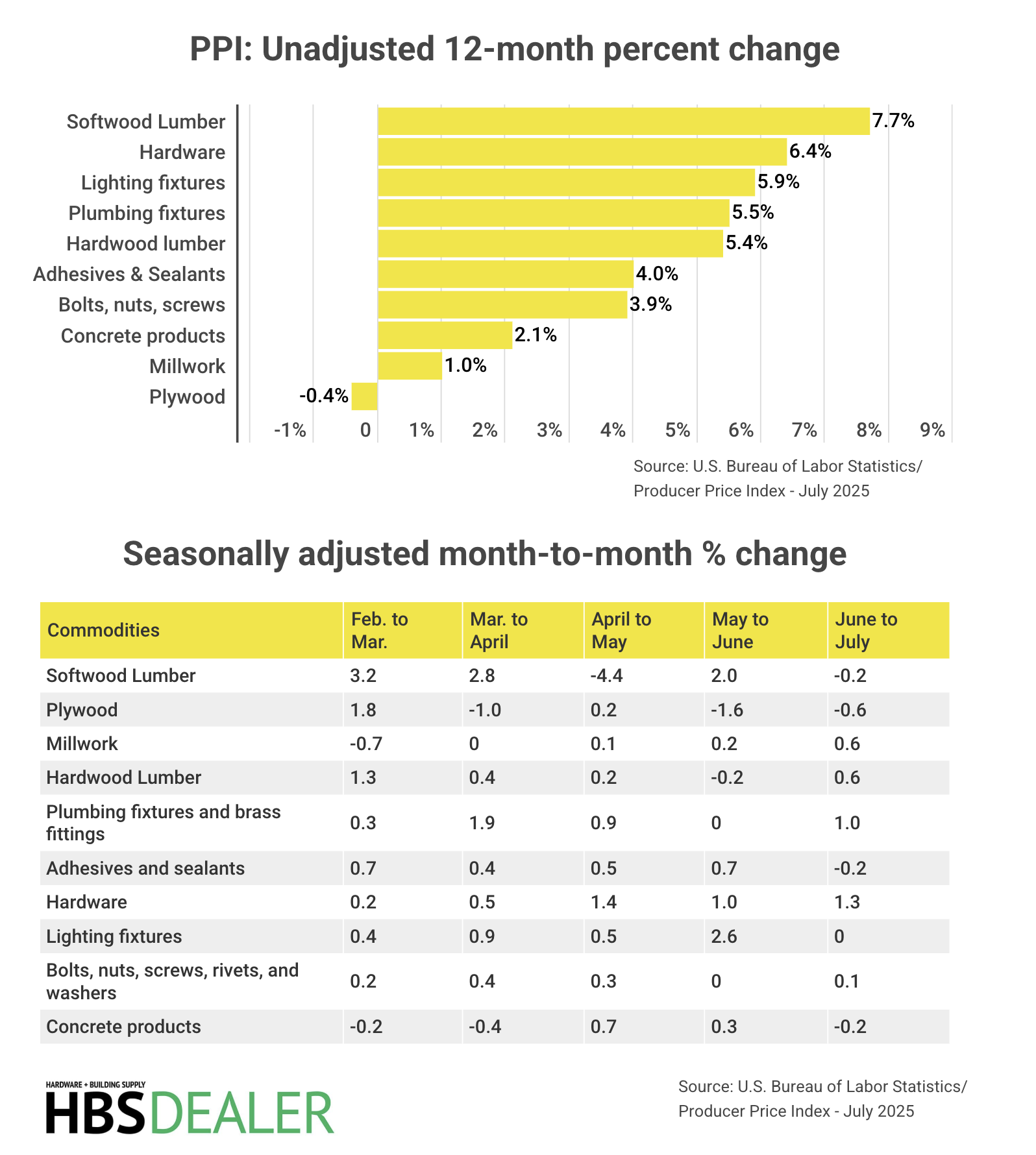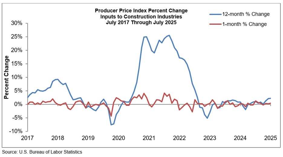 건설 자재와 건축 자재 가격은 합판(-0.6%), 침엽수 제재목(-0.2%), 페인트 자재(-0.5%), 시멘트와 콘크리트 제품(둘다 -0.2%)을 제외하고는 대부분 전월 대비 상승했습니다. 한편 전년대비 침엽수 제재목 가격은 7.7%, 활엽수 제재목 가격은 5.4% 상승했습니다. 전월 대비 1.3% 상승한 하드웨어 가격은 연간 기준으로 6.4% 상승했습니다. Associated Builders and Contractors에 따르면 7월 건설 투입 가격은 전월 대비 0.4% 상승했고, 전체 건설 투입 가격은 전년 대비 2.2% 상승했으며, 비주거용 건설 투입 가격은 2.6% 상승했습니다. ABC 수석 경제학자인 Anirban Basu는 비주거용 투입 가격은 1월 이후 연율 5.8% 상승했으며, 무역 정책은 향후 몇 달 동안 자재 가격에 계속해서 상승 압력을 가할 것으로 예상합니다. 예를 들어 구리선과 케이블 가격은 7월에 5% 급등했으며, 지난 1년 동안 12.2% 상승했습니다. Anirban Basu는 7월 생산자 물가 지수의 급격한 상승은 건설 투입 비용 상승만큼이나 우려 스러운 일이라고 덧붙였다. 최종 수요 상품과 서비스 가격이 2022년 3월 이후 가장 빠른 속도로 상승함에 따라, 연준(Federal Reserve)은 9월 회의에서 금리 인하 여부를 결정할 때 인플레이션 재발 가능성을 고려해야 할 것입니다. 건설 업계는 차입 비용 절감이 절실히 필요하며, 장기적으로 높은 금리가 유지된다면 건설 지출에 지속적인 부담이 될 것이라고 언급하였습니다.