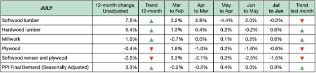 미국 노동 통계국(U.S. Bureau of Labor Statistics)에 따르면 2025년 7월 침엽수 제재목 생산자 물가 지수(Producer Price Index : PPI)는 0.2% 하락했습니다. 활엽수 제재목 PPI는 0.6% 상승하여 6월의 0.2% 하락세를 반전했습니다. 목공품 가격은 7월에 0.6% 상승하여 전월의 0.2% 상승세를 이어갔습니다. 합판 가격은 6월의 1.6% 급락 후 0.6% 하락했습니다. (참고: 침엽수 베니어와 합판 수치는 7월 보고서에 발표되지 않았으며, 현재 데이터 시리즈에서는 더 이상 추적되지 않을 수 있습니다.)