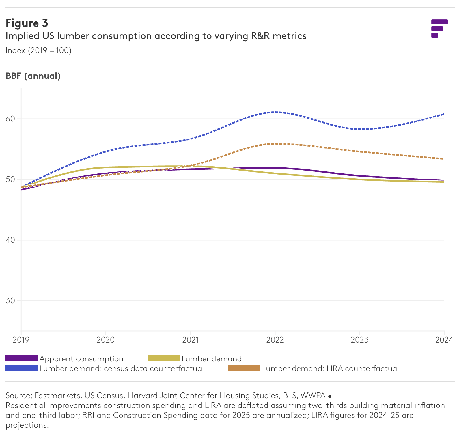 러시아의 건설 활동이 지속적으로 감소하고 있음에도 불구하고, 7월 러시아 자국내 제재목 수요는 증가했습니다. 2025년 7월 러시아의 제재목 소비량은 전년 대비 16% 증가한 반면, 건설 활동은 14% 감소했습니다. 7월 주요 제재목 가격은 전월 수준을 유지했지만, 전년 대비로는 3% 상승했습니다. 8월에는 소폭 하락세를 보였으며, 9월에는 가격이 안정세를 유지한 후 4분기 초에 하락 조정이 예상될 것으로 전망했습니다.