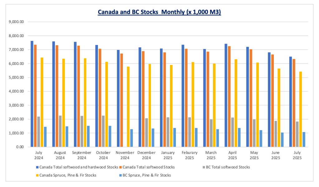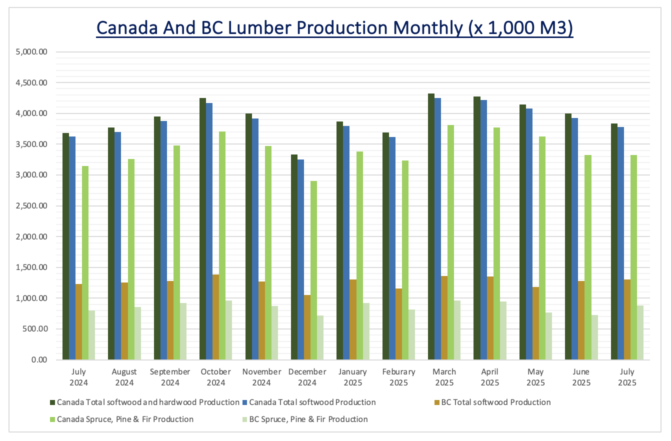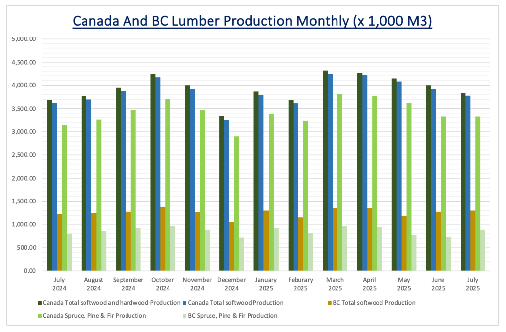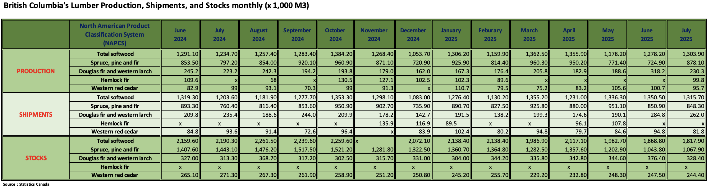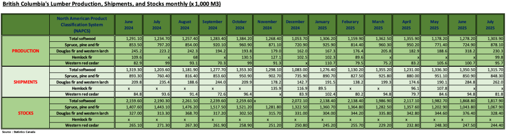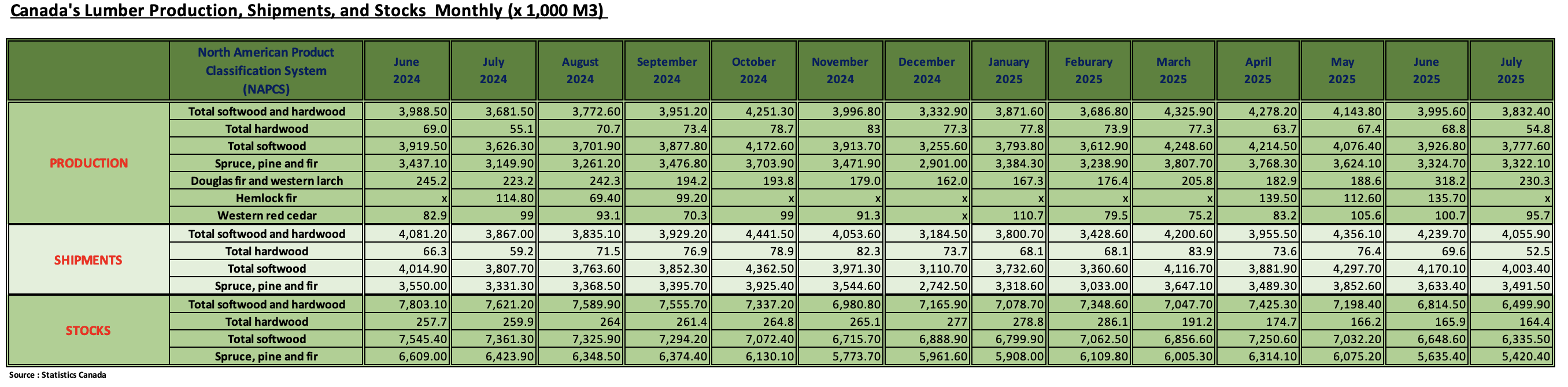 2025년 7월 캐나다 제재소들은 제재목을 3,832,0000 m3 생산하여 6월과 비교하면 4.1% 감소하였고, 7월 출하량은 4.3% 감소하여 4,056,000 m3이었습니다. 캐나다 통계청(Statistics Canada)에 따르면 2024년 7월에 비하여 생산량은 4.1%, 출하량은 4.9% 증가하였습니다.