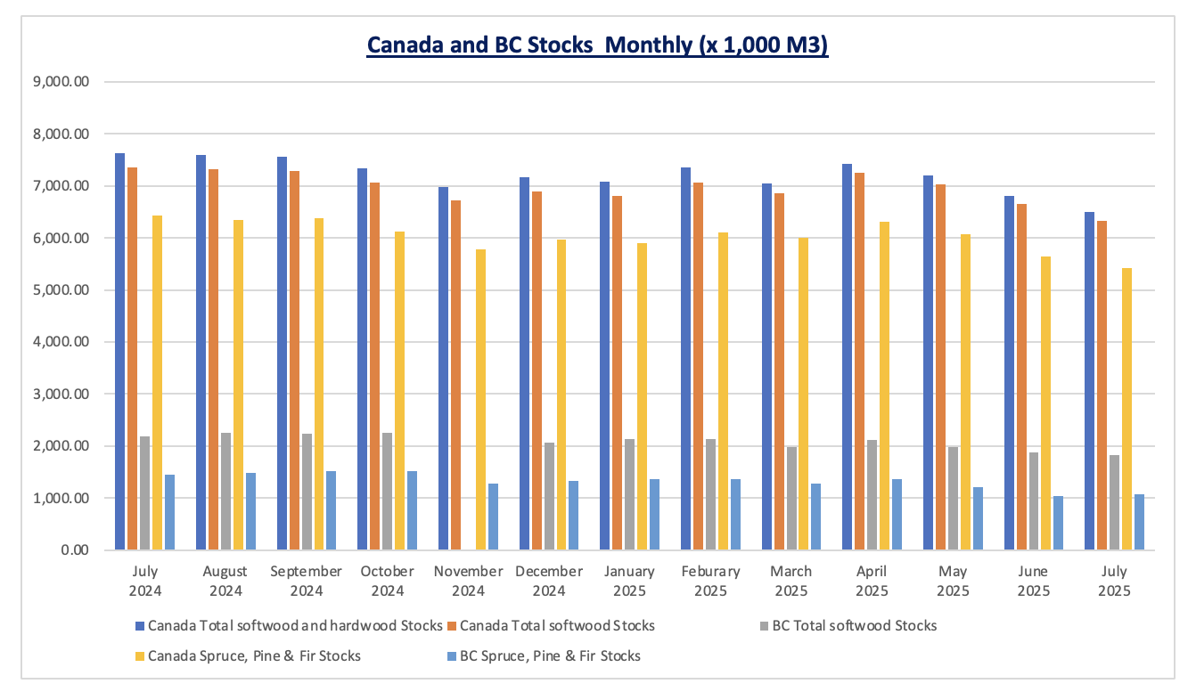 7월 캐나다 목재 제품 제조 부문의 가동률은 70.9%로, 2024년 7월보다 1.9%포인트 높았지만 2025년 6월보다 6.0%포인트 낮았습니다.