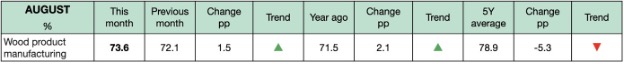 2025년 8월 캐나다 목재 제품 제조 생산능력은 73.6%를 달성 17 Friday Oct 2025 Posted by KIM, HANSEOK in Uncategorized ≈ Leave a comment 2025년 8월 캐나다 목재 제품 제조업 부문의 가동률은 73.6%로 전월 72.1%에서 상승했습니다. 이는 전월 대비 1.5%포인트, 전년 동기 대비 2.1%포인트 상승한 수치입니다. 그러나 캐나다 통계청(Statistics Canada)에 따르면 현재 가동률은 5년 평균인 78.9%보다 5.3%포인트 낮습니다. Share this: Click to email a link to a friend (Opens in new window) Email Click to print (Opens in new window) Print Click to share on X (Opens in new window) X Click to share on Facebook (Opens in new window) Facebook Click to share on LinkedIn (Opens in new window) LinkedIn More Click to share on Pinterest (Opens in new window) Pinterest Click to share on Tumblr (Opens in new window) Tumblr Click to share on Reddit (Opens in new window) Reddit Click to share on Pocket (Opens in new window) Pocket Like Loading... Related