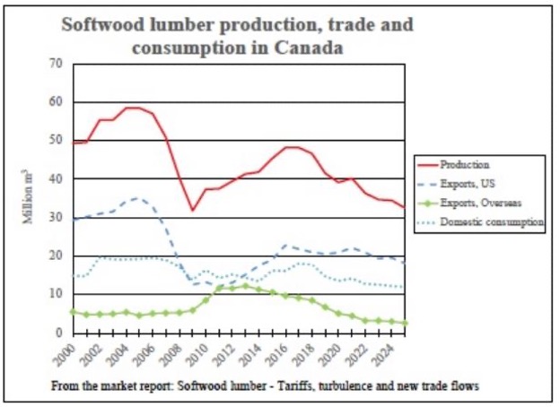 캐나다 제재목 산업은 수출 의존도가 매우 높습니다. 캐나다 제재목 생산량의 약 65%가 해외로 수출되며, 미국은 여전히 최대 수출국으로, 2025년 수출량의 약 87%를 차지합니다. 이러한 수출 의존도로 인해 캐나다는 미국의 무역 정책에 크게 노출됩니다. 2025년 미국은 캐나다산 제재목에 무역법 232조 관세와 반덤핑(AD)과 상계관세(CVD) 인상 등 새로운 무역 장벽을 부과했습니다. 새로운 시장 보고서인 “침엽수 목재 – 관세, 혼란, 그리고 2030년까지의 새로운 무역 흐름”에 따르면, 이러한 조치들이 합쳐지면 캐나다 생산자들의 생산 비용이 약 25%-30% 증가하여 가격 경쟁력이 크게 약화되고 많은 제재소의 마진이 마이너스로 떨어질 것으로 예상됩니다. 이에 따라 캐나다는 중국, 일본, 인도, 유럽, 중동 등의 지역에서 시장 다각화를 더욱 확대할 것으로 예상됩니다. 그러나 다각화는 쉽지 않습니다. 캐나다산 제재목은 북미산 등급과 규격에 따라 제조되는 반면, 해외 시장에서는 다른 규격을 사용하기 때문입니다. 운송 거리가 길고 물류 비용이 높으며, 이러한 지역에서 신뢰할 수 있는 장기적인 관계를 구축하는 데는 시간이 걸립니다. 2025년 현재 미국 외 지역으로의 수출량은 역사적 최저 수준에 가깝습니다(2025년 수출량의 13%, 지난 20년간 평균 ~20%). 즉, 다각화가 느리게 진행될 것이며 단기적으로 미국 접근성 감소를 상쇄하기 어려울 것으로 예상됩니다.