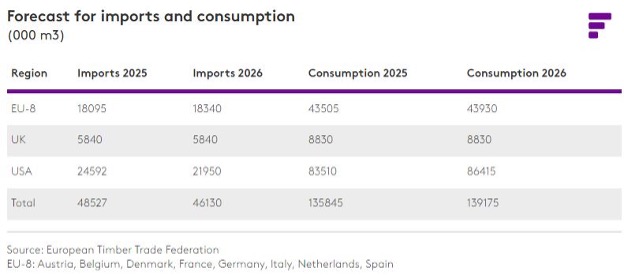 수요 측면에서, EOS 회원국과 영국의 제재목 소비량은 2024년에 2.1% 증가하여 42.8 million m3에 달했는데, 이는 2021년 수준보다 13% 낮은 수치입니다. 유럽 목재 무역 연맹(European Timber Trade Federation : ETTF)은 2025년 43.5 million m3, 2026년 43.9 million m3로 소비량이 소폭 증가할 것으로 전망합니다. Tommi Sneck은 3년 연속으로 2025년 1-2사분기는 수출과 유럽 소비가 소폭이나마 증가하며 일부 유럽 국가에 희망을 안겨주었다고 지적하며, 여름은 실망스러웠고 업계 전반은 향후 몇 달이 좋지 않을 것이라는 전망이 우세하다고 덧붙였다. 수입량 역시 완만한 회복세를 보이고 있습니다. 주요 유럽 시장으로의 2024년 총 수입량은 48.2 million m3로 전년 대비 5.4% 증가했습니다. ETTF 부회장 Morten Bergsten은 2025년 수입량을 48.5 million m3로 예상하고, 2026년에는 46.1 million m3로 소폭 감소할 것으로 전망하는데, 이는 주로 미국 수입 감소에 따른 것입니다.
