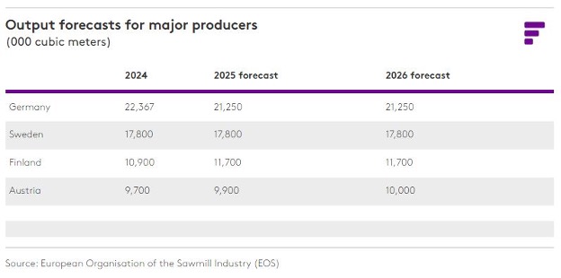 독일은 2021년 정점 이후 가장 큰 폭의 생산량 감소를 경험한 반면, 핀란드는 2025년 11.7 million m3로 증가할 것으로 예상되며 회복세를 보이고 있습니다. 오스트리아, 스웨덴, 그리고 소규모 생산국 중 라트비아와 노르웨이는 대체로 생산량 수준을 안정화 했습니다.