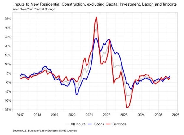제품 구성 요소는 주거용 건설 가격 지수에 대한 투입에서 더 큰 비중을 차지하며 약 60%를 차지합니다. 월별로 보면 신규 주택 건설에 대한 제품 투입 가격은 9월에 0.1% 상승했습니다. 주거용 건설에 투입되는 제품 지수는 두 가지 요소로 더 세분화될 수 있는데, 하나는 에너지 투입량을 측정하고 다른 하나는 나머지 제품을 측정합니다. 두 요소 중 나머지 제품은 주거용 건설에 사용되는 건축 자재를 나타내며, 제품 지수의 약 93%를 차지합니다. 9월 에너지 투입 가격은 1.0% 상승하여 전년 대비 3.0% 상승했습니다. 건축 자재 가격은 9월 0.1% 상승하여 전년 대비 3.5% 상승했습니다. 전년 대비 3.5% 상승률은 2023년 1월 4.9% 이후 가장 큰 폭의 상승률입니다. 주거용 건축자재 가격 상승률은 2.0% 초반에서 시작하여 올해 들어 완만하게 상승했습니다. 전년 대비 가장 큰 가격 변동을 보인 품목은 건설 기계와 장비 부품으로, 별도 판매 가격은 작년 9월 대비 41.3% 상승했습니다. 금속 몰딩과 트림 가격은 작년 대비 31.0% 상승했습니다. 신규 주택 건설의 핵심 요소인 레미콘은 2025년 가격 상승률이 미미하여 작년 대비 0.4% 상승에 그쳤습니다. 또한, 침엽수 제재목 가격은 9월에 전년 대비 2.3% 하락했습니다. 관세 인상에도 불구하고 지난 몇 달 동안 제재목 가격은 하락세를 보였습니다. 2025년 신규 주택 건설의 지속적인 부진으로 인해 제재목 시장의 공급 과잉이 심각 해졌고, 수요는 예상을 밑돌았습니다.