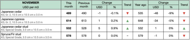일본 농림수산성(Ministry of Agriculture, Forestry and Fisheries of Japan)에 따르면 2025년 11월 일본 cedar 제재목의 평균 도매가는$489/m³였습니다. 이는 10월 $490/m³ 대비 $1(0.1%) 하락한 수치이며, 2024년 11월 $535/m³ 대비 $46(8.6%) 하락한 수치입니다. 일본 cypress 제재목의 평균 도매가는 $614/m³로, 10월 $613/m³ 대비 $1(0.2%) 상승했습니다. 이 가격은 2024년 11월 $648/m³ 대비 $34(5.3%) 하락한 수치입니다. 일본 cedar 스터드 목재의 평균 도매가는 $532/m³로, 10월 $528/m³ 대비 $4(0.9%) 상승했습니다. 2024년 11월과 동일한 가격입니다.