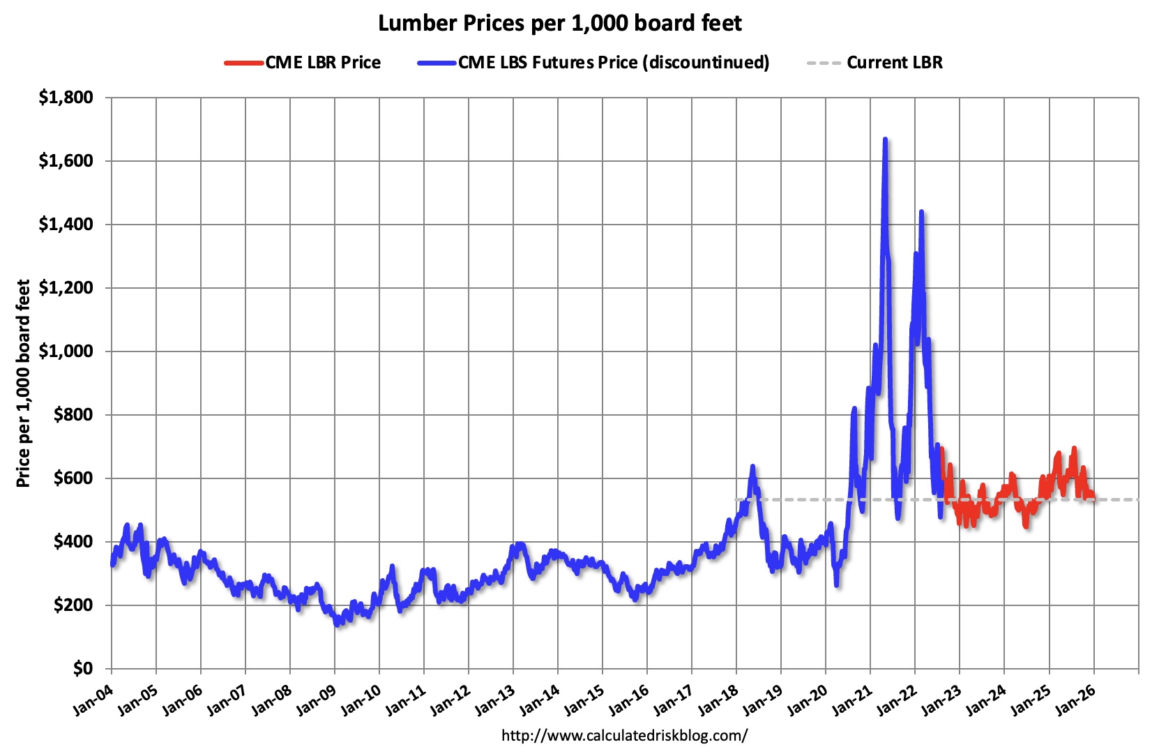 2026년 1월 2일 기준으로 LBR은 $534.00/1,000 board feet로 전년 동기 대비 1.6% 하락했습니다. 제재목 수요는 계절적인 변동이 어느정도 있으며, 제재목 가격은 대개 상반기에 최고치를 기록합니다. 2018년 초의 증가세는 2017년 트럼프 행정부의 제재목 관세 때문이었습니다. 팬데믹 기간 동안에는 공급 제약과 주택 신축 건수 증가가 복합적으로 작용하여 크게 증가했습니다. 현재 관세가 부과되었음에도 불구하고 가격은 전년 대비 거의 변동이 없어 골조용 제재목에 대한 수요가 약세를 보이고 있음을 시사합니다.