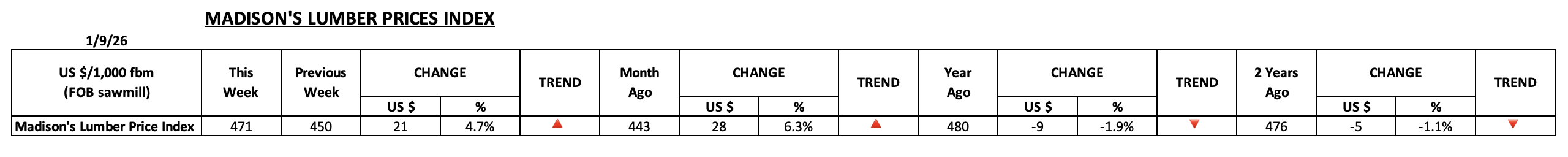 Madison 제재목 가격 지수(Madison’s Lumber Prices Index)는 2026년 1월 9일로 마감한 주에 5% 상승한 $471/thousand board feet를 기록하며 주간 $21 상승폭을 보였습니다. 주요 북미 수종의 생산량 가중 평균 가격을 추적하는 이 지수는 한 달 전과 비교해서도 6% 상승했다고 Madison’s Lumber Reporter는 전했습니다. 지난주 지수는 $450 mfbm였으며, 한 달 전 수치는 $443 mfbm였습니다. 이 지수는 제재목 선물과 동일한 수종 그룹(Western & Eastern Spruce-Pine-Fir, Douglas fir, Hem-Fir)을 사용하여 구성되며, 가중치는 최근 몇 년 간의 북미 생산량 비율을 기준으로 합니다. 주간 상승폭은 북미 제재목 시장의 지속적인 움직임을 반영합니다.