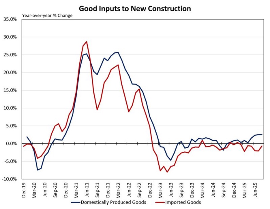 미국 노동 통계국(BLS)에서 발표하는 생산자 물가 지수(PPI)에 최근 신규 건설 부문 투입재 관련 새로운 실험 데이터가 추가되었습니다. 이 데이터는 기존 산업 지수에 수입 가격과 국내 생산 재화와 서비스 가격을 통합하여 투입재를 확장한 것입니다. 이 추가 데이터를 통해 사용자는 국내 생산 제품과 수입 제품 간의 산업 투입 비용 변화를 추적할 수 있습니다. 이 데이터는 신규 건설 부문에 초점을 맞추고 있지만, 전체 데이터 세트는 미국 노동 통계국(BLS) 웹사이트에서 확인할 수 있으며 다양한 산업 분야의 지수를 포함하고 있습니다. 신규 건설 투입 가격은 주로 국내 생산 재화와 서비스의 영향을 받으며, 신규 건설 산업 지수에서 국내 제품이 90%의 가중치를 차지합니다. 수입품은 나머지 10%를 구성합니다. 2025년 8월 기준 최신 데이터에 따르면 신규 건설에 사용되는 국내 생산품의 가격 상승률이 수입품보다 여전히 빠른 것으로 나타났습니다. 전년 동기 대비 국내 생산품 지수는 2.5% 상승한 반면, 수입품 가격은 같은 기간 동안 0.7% 하락했습니다.