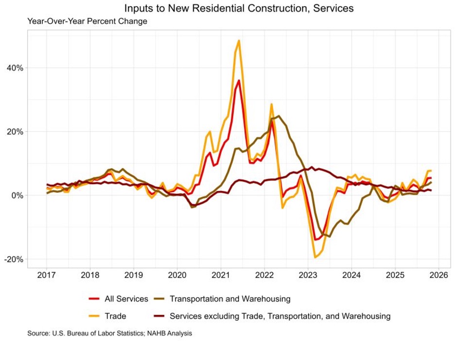 2025년 11월 주택 건설 서비스 투입 가격은 0.4% 하락한 것으로 나타났습니다. 전년 동기 대비로는 5.6% 상승했습니다. 주택 건설 서비스 투입 가격 지수는 무역 서비스, 운송과 창고 서비스, 그리고 무역, 운송, 창고를 제외한 기타 서비스의 세 가지 구성 요소로 나뉩니다. 가장 큰 비중을 차지하는 것은 무역 서비스(약 60%)이며, 그 다음으로 기타 서비스(약 29%), 마지막으로 운송과 창고 서비스(약 11%) 순입니다. 가장 큰 비중을 차지하는 무역 서비스는 전년 대비 7.7% 상승했습니다. 운송과 창고 서비스는 4.2% 상승했고, 기타 서비스 가격은 전년 대비 1.5% 상승했습니다.