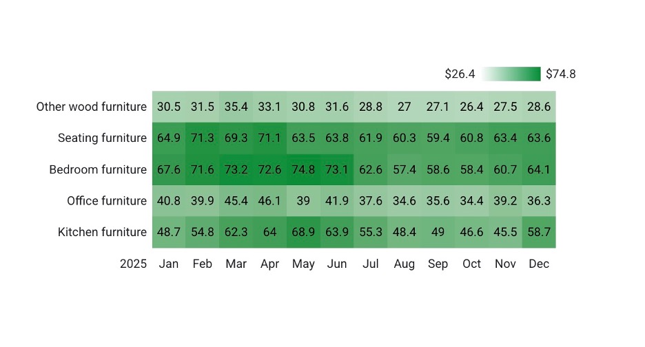 전반적으로 2025년 중국의 목재 가구 수출량은 총 4억 8,108만 개로 전년 동기 대비 2.7% 증가했습니다. 수출액은 $20.8 billion에 달했으며, 개당 평균 가격은 $43.2로 2024년 대비 12.4% 하락했습니다.