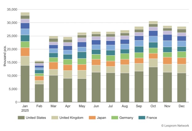 호주 수출은 0.7% 감소한 2,160만 개, 수출액은 $1.42 billion로 4.1% 감소했습니다. 캐나다의 수출은 15.4% 증가한 1,537만 개로 시장 점유율 3.2%를 기록했지만, 수출액은 3.9% 감소한 $0.77 billion였습니다. 한국은 1,348만 개를 수입하여 7.3% 증가했으며, 수입액은 $0.79 billion로 23.9% 감소했습니다. 평균 가격은 개당 $59로 29.1% 하락했습니다. 폴란드의 수입량은 1,111만 개로 16.1% 증가했으며, 수입액은 $0.25 billion로 17.2% 증가했습니다.