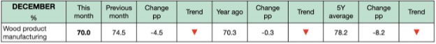 캐나다 목재 제품 생산 설비 가동률이 2025년 12월에 70.0%로 하락 17 Tuesday Feb 2026 Posted by KIM, HANSEOK in Uncategorized ≈ Leave a comment 캐나다 통계청(Statistics Canada)이 발표한 자료에 따르면, 캐나다의 목재 제품 제조업 설비 가동률은 2025년 12월에 70.0%를 기록했으며, 이는 2025년 11월의 74.5%에서 하락한 수치입니다. 이 비율은 2024년 12월의 70.3%에서 0.3%포인트 하락한 수치입니다. 12월의 70.0%는 2024년 7월 69.6% 이후 가장 낮은 수준이었습니다. Share this: Email a link to a friend (Opens in new window) Email Print (Opens in new window) Print Share on X (Opens in new window) X Share on Facebook (Opens in new window) Facebook Share on LinkedIn (Opens in new window) LinkedIn More Share on Pinterest (Opens in new window) Pinterest Share on Tumblr (Opens in new window) Tumblr Share on Reddit (Opens in new window) Reddit Share on Pocket (Opens in new window) Pocket Like Loading... Related