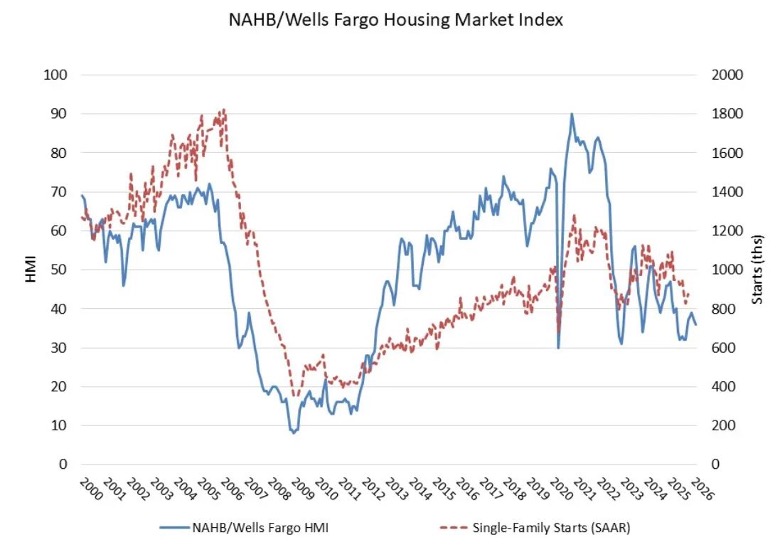 전미 주택 건설업체 협회(National Association of Home Builders : NAHB)/ Wells Fargo 주택 시장 지수(Housing Market Index : HMI)에 따르면 2026년 2월 신규 단독주택 시장에 대한 건설업체들의 신뢰도는 1포인트 하락한 36을 기록했다. 높은 주택 가격 대비 소득 비율과 높은 토지와 건설 비용을 포함한 지속적인 주택 구매력 저해 요인으로 인해 건설업체들의 경기 전망에 대한 신뢰도가 올해 들어 두 달 연속 하락했습니다.