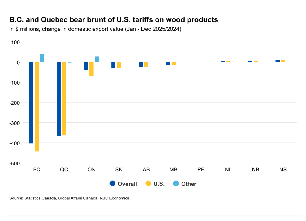 최근의 생산량 감축과 제재소 폐쇄로 캐나다 임업 분야가직면한 어려움이 더욱 심화되었습니다. 목재 제품 제조업의 평균 산업 설비 가동률은 10년 전보다 약 10% 포인트 하락한 75%를 기록할 것으로 예상되며, 제재소와 목재 방부 처리 분야의 고용은 2017년 5월부터 2025년 11월 사이에 약 20% 감소했고, 특히 B.C. (-32%)와 Quebec (-13%)에서 더욱 두드러진 감소세를 보였습니다. 해당 분야는 향후 여러 가지 역풍에 직면할 것입니다. 미국 주택 건설의 둔화와 올해와 내년 캐나다 주택 신축 건수 감소 전망은 단기적인 수요 압박 요인으로 작용할 것입니다. 국내 공급 감소는 펄프와 제지 공장, 건설업과 같은 하류 산업에도 압력을 가할 수 있습니다. 수요 부진과 공급 제약이 겹치면 생산량 감축과 공장 폐쇄 위험이 더욱 커집니다. 하지만 이러한 압력은 또한 사업 재편의 기회를 제공하기도 합니다. 특히 아시아 지역을 중심으로 새로운 수출 시장을 개발하고, 국내 수요를 증진하며, 대량 목재(mass timber)와 같은 고부가가치 제품 생산을 확대하는 데 초점을 맞춘 연방과 주 정부 차원의 정책은 수익원을 다변화하고 수익성을 개선하며 해당 부문의 장기적인 경쟁력 강화를 가속화하는 데 도움이 될 수 있습니다. 캐나다와 미국 간의 침엽수 제재목 분쟁은 향후 CUSMA(Canada-United States-Mexico Agreement, 미국-캐나다-멕시코 무역협정) 검토에서 중요한 쟁점이 될 가능성이 높습니다. 지속 가능한 무역 분쟁 해결은 여전히 중요하지만, 그 성공 여부는 전통적인 침엽수 제재목 수출과 더불어 새로운 시장에 진출하고 고부가가치 제품을 개발하는 업계의 능력에 점점 더 달려 있습니다.
