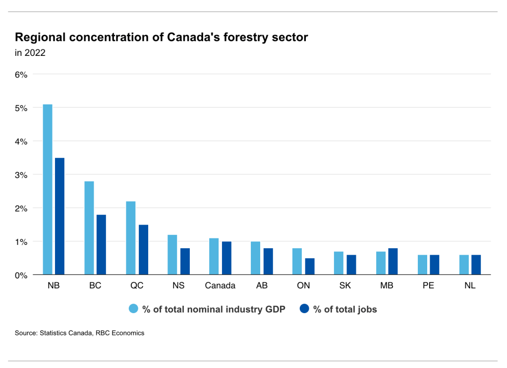캐나다의 임업 분야는 국내 경제에 중요한 기여를 하고 있으며, 2024년에는 명목 산업 총생산의 1%에 해당하는 $23 billion를 차지할 것으로 예상됩니다. 이는 예술, 엔터테인먼트, 레크리에이션 산업보다 큰 규모입니다. 이 산업은 약 194,000명의 캐나다인을 직접 고용하고 있으며, 지리적으로 집중되어 있어 고용된 캐나다인의 거의 86%가 Quebec, B.C., Ontario, Alberta의 4개 주에 집중되어 있습니다. 2022년 임업 분야는 산업 GDP에서 상당한 비중을 차지했으며, New Brunswick에서 5.1%, B.C.에서 2.8%, Quebec에서 2.2%를 기록했습니다. B.C.에서는 제재소와 목재 방부 처리 산업이 2024년 최대 제조업 분야 이었으며, 미국으로의 침엽수 제재목 수출은 전체 상품 수출의 약 6%를 차지했습니다. 중요한 점은 임업 산업이 외딴 지역 사회 경제의 중심인 경우가 많다는 것입니다. B.C.에서는 Prince George에서 9%, Quesnel에서 21%의 고용을 임업이 차지하고 있으며, Quebec에서는 Saint-Georges에서 6%, Dolbeau-Mistassini에서 13%를 차지합니다. 이러한 지역 사회는 무역 장벽의 영향에 특히 취약할 수 있습니다.