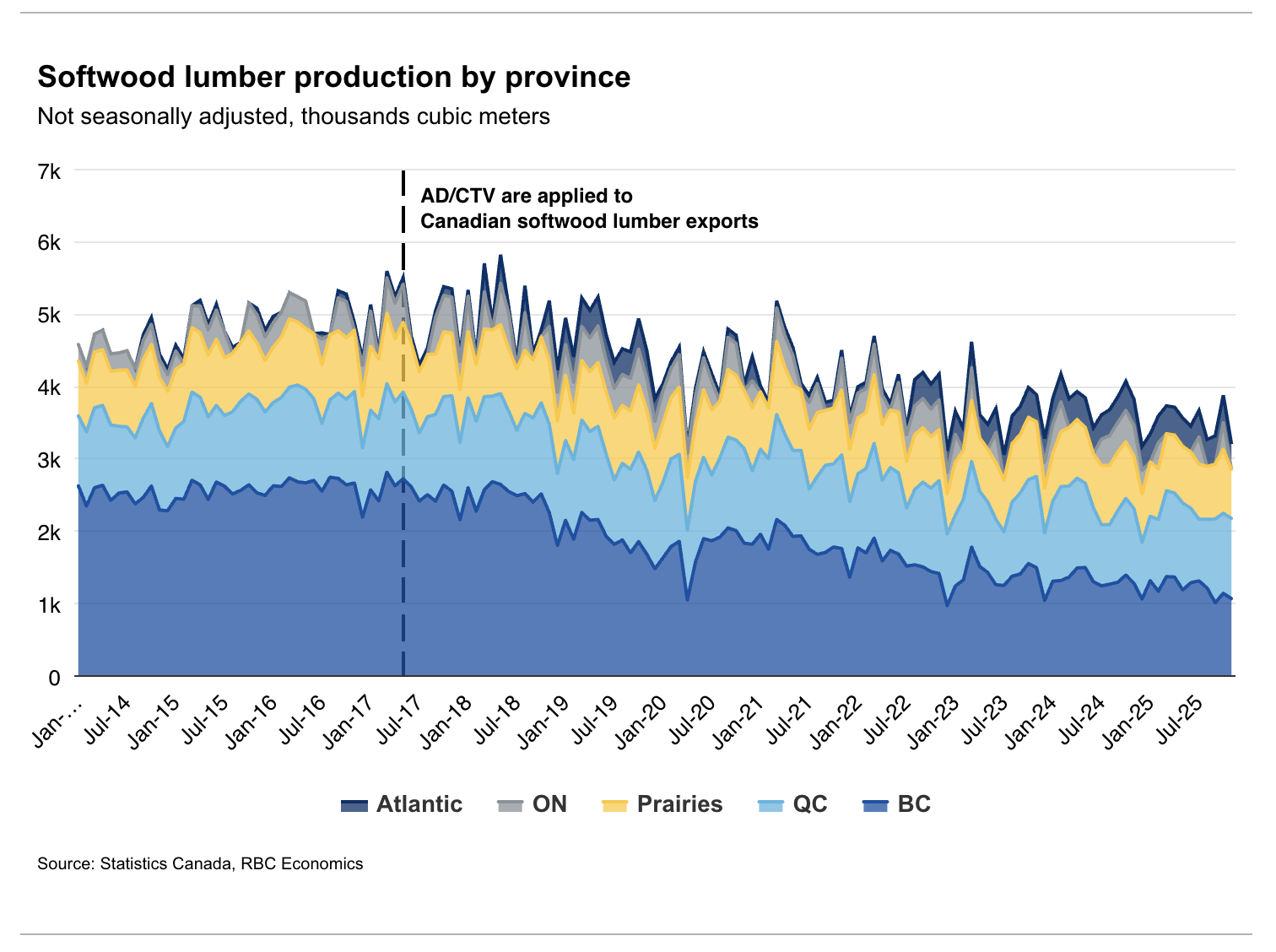 2017년 5월 이후 부과된 반덤핑과 상계관세는 산불, mountain pine beetle 감염, 규제 개혁, 비용 상승을 포함한 기존의 문제들이 특정 취약 지역들을 더욱 악화시켰습니다. 캐나다의 침엽수 제재목 생산량은 2017년에서 2024년 사이에 약 26% 감소했으며, 특히 B.C.에서 감소폭이 더 커서 현재 생산량은 2017년 수준의 절반 정도에 불과합니다. 생산에 미치는 충격은 미국 수출에도 반영되어서 캐나다의 미국 수출액은 2017년 총 미국 수입액의 약 87%에서 2025년에 71%로 감소할 것으로 예상됩니다. 침엽수 제재목 수출의 총 명목 가치는 14% 감소했고, 수출 물량은 같은 기간 동안 약 27% 감소했습니다.
