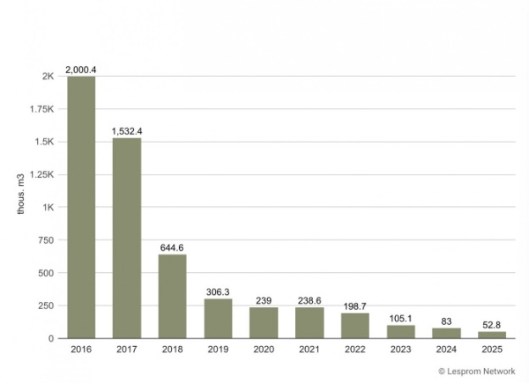 중국산 목재 합판 수출량이 9년 연속 감소하고 있습니다. 미국의 중국 활엽수 합판 수입량은 2016년 약 2,000,000 m³에서 2025년 52,800 m³로 약 38배 감소할 것으로 예상됩니다.