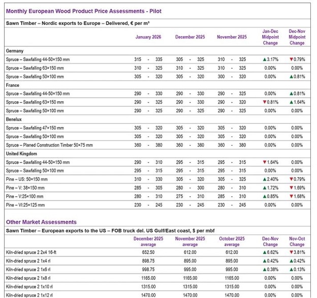 유럽 제재목 시장은 2026년 초 조심스러운 분위기 속에서 출발했습니다. 북유럽 수출업체들은 지속적인 수요 부진, 허리케인 요하네스(Johannes) 이후 변화하는 공급 상황, 그리고 1사분기 말까지 개선될 것이라는 조심스러운 낙관적 전망 등 복잡한 시장 환경 속에서 고심했습니다. 1월 시장 분석 결과, 구조적인 역풍이 여전히 시장을 지배하고 있는 것으로 나타났지만, 일부 업계 관계자들은 경기 침체의 최악의 상황이 안정화되고 있을 것이라는 조심스러운 희망을 표명했습니다.